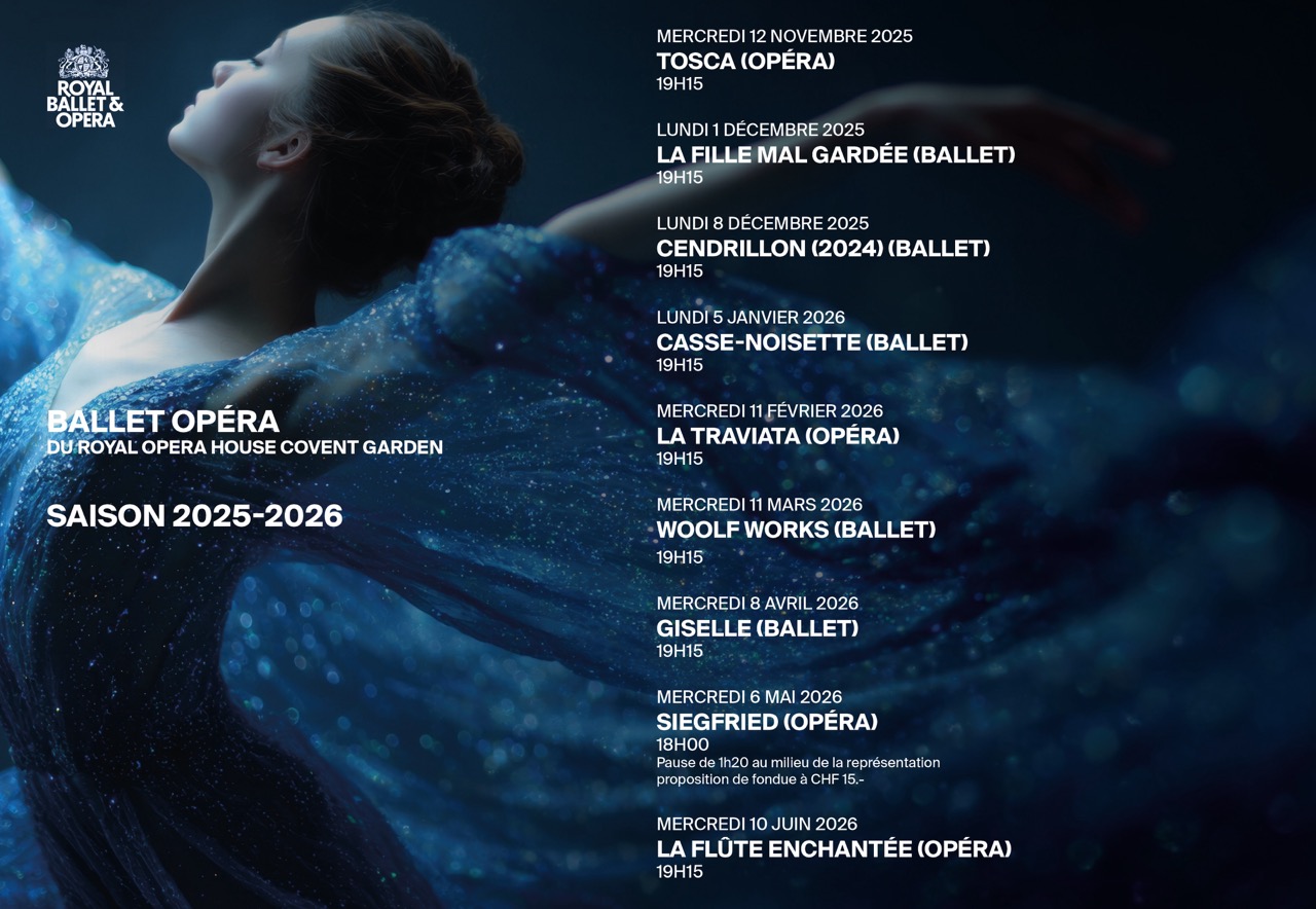 Ballets emblématiques, opéras intemporels ou nouvelles productions, chaque séance offre une expérience fidèle aux représentations du Royal Opera House, projetée en haute définition pour permettre au public du Val-de-Travers de vivre ces spectacles d'exception comme s'il était à Londres.
